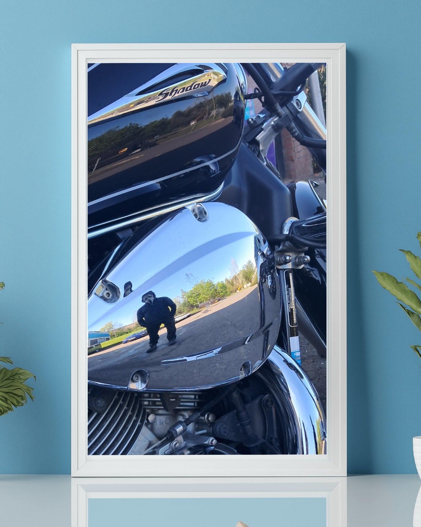 Dark, detailed, and dripping with attitude – Chrome Reaper is not your average motorcycle print. Captured by Cuba Prints, this striking piece features the iconic Honda Shadow in all its gleaming glory, with a chilling twist: a shadowy figure dressed in black and wearing the infamous Scream mask, reflected hauntingly in the chrome.