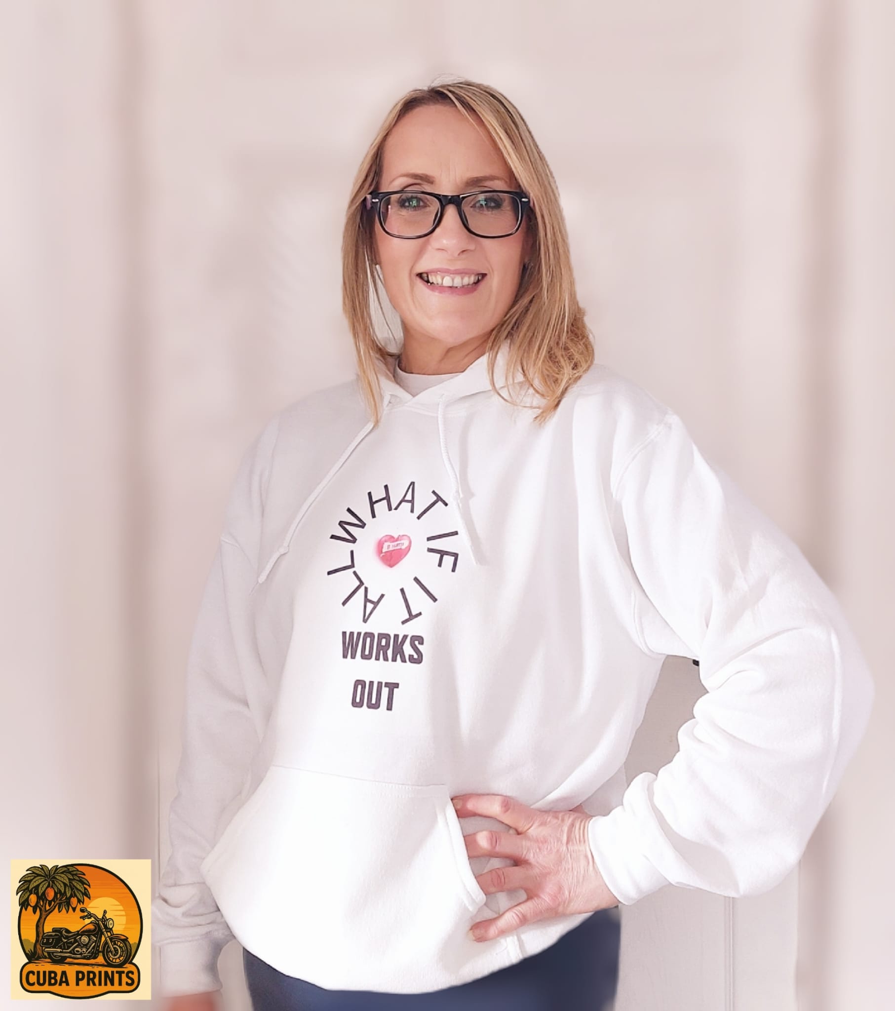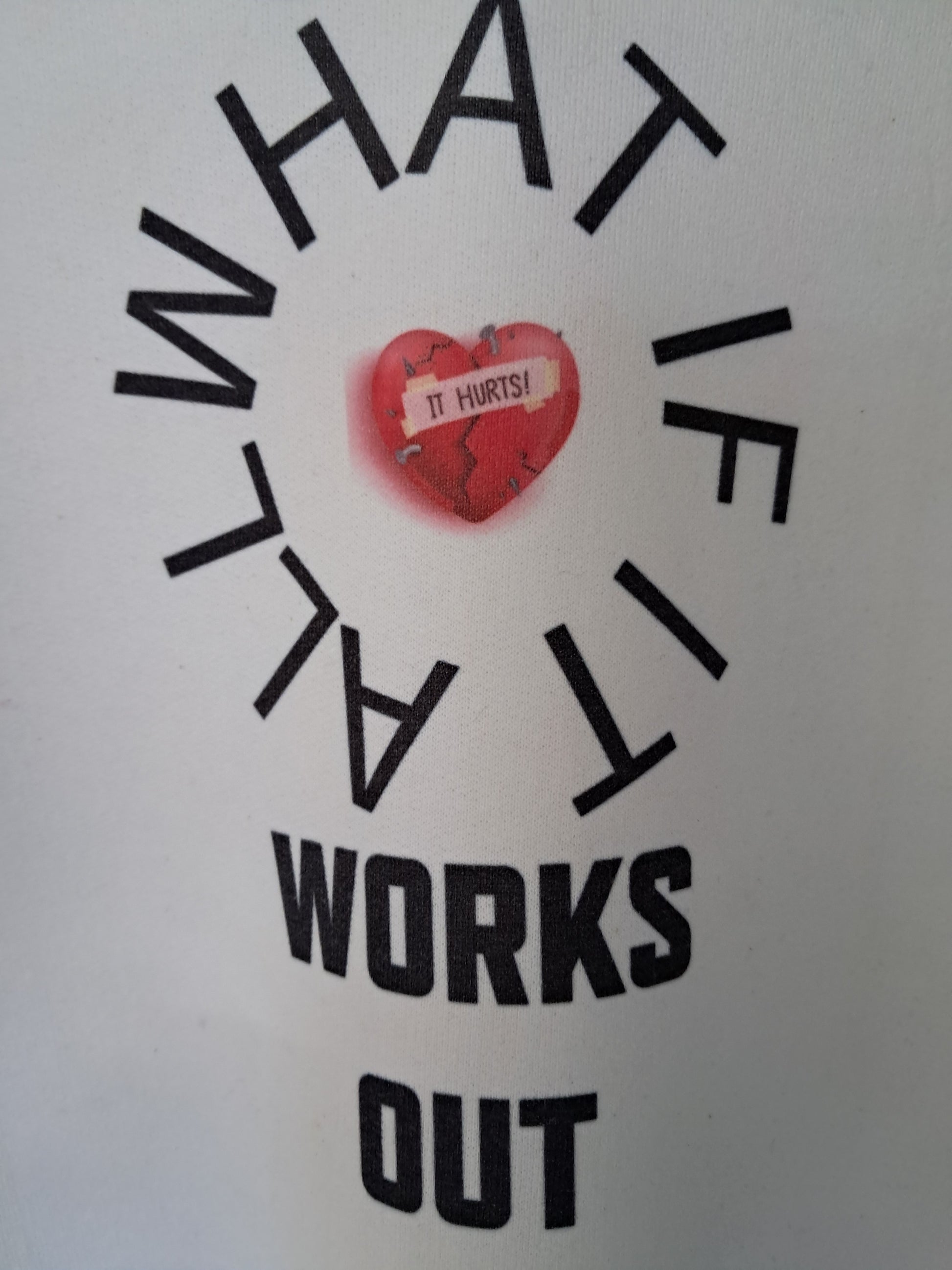 Bold yet vulnerable, this white hoodie speaks to the dreamers and the healing hearts. Featuring the hopeful phrase “What if it all works out” across the chest, it’s a gentle reminder to hold on to optimism—even when things feel uncertain. At the center, a minimalist heart holds the words “It hurts”—an honest reflection of the pain we sometimes carry while still choosing to believe in brighter days.